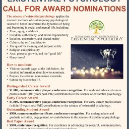 The International Society for the Science of Existential Psychology (issep.org) is calling for Annual Awards Nominations, described below, due Nov 15. Self-nominations permitted.