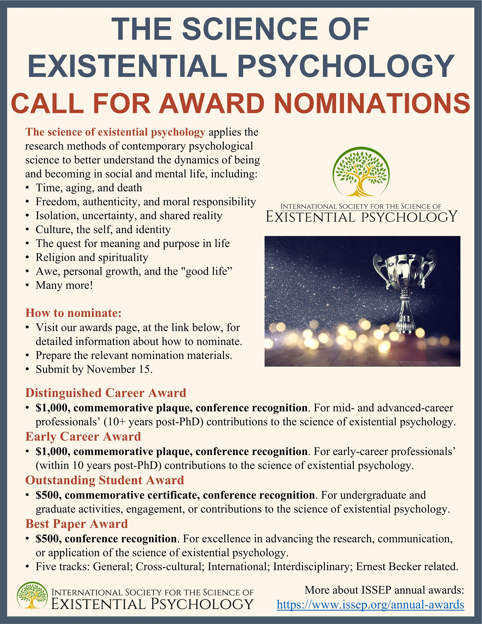 The International Society for the Science of Existential Psychology (issep.org) is calling for Annual Awards Nominations, described below, due Nov 15. Self-nominations permitted.
